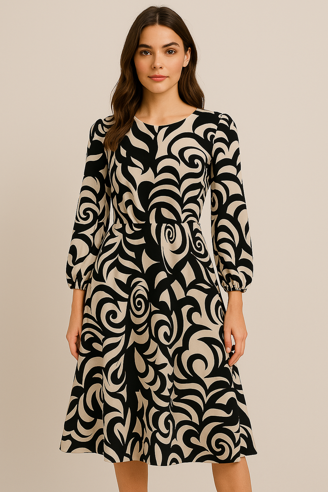 Zwiewna lekka sukienka marki Emoi w efektowny beżowo-czarny wzór to idealna propozycja dla kobiet ceniących styl i komfort. Lekko rozkloszowany fason z długością za kolano pięknie podkreśla sylwetkę, a delikatny materiał zapewnia wygodę noszenia przez cały dzień. Sukienka posiada długie rękawy zakończone gumką oraz okrągły dekolt. Z tyłu zapinana na suwak. Doskonale sprawdzi się zarówno na co dzień, jak i na wyjątkowe okazje. Skład: 100% wiskoza Model wygenerowany komputerowo. Ubranie przedstawia rzeczywisty produkt.