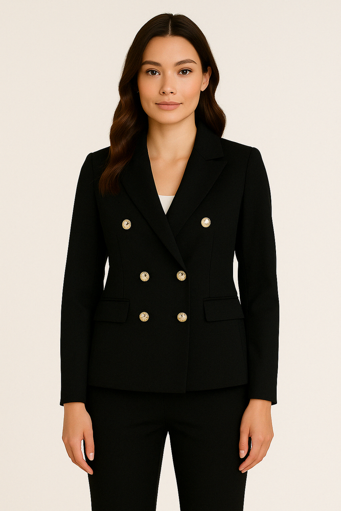 Elegancki żakiet marki Emoi w ponadczasowym czarnym kolorze to must-have w kobiecej garderobie. Klasyczny fason z klapami i złotymi, dekoracyjnymi guzikami w stylu dwurzędowym nadaje mu luksusowego charakteru. Doskonale sprawdzi się w zestawieniu zarówno z dopasowanymi spodniami, jak i spódnicą. Idealny do biura, na wieczorne wyjście lub jako element eleganckiego total looku. Skład: 63% poliester, 33% wiskoza, 4% elastan Model został wygenerowany komputerowo. Produkt przedstawia rzeczywistą odzież.