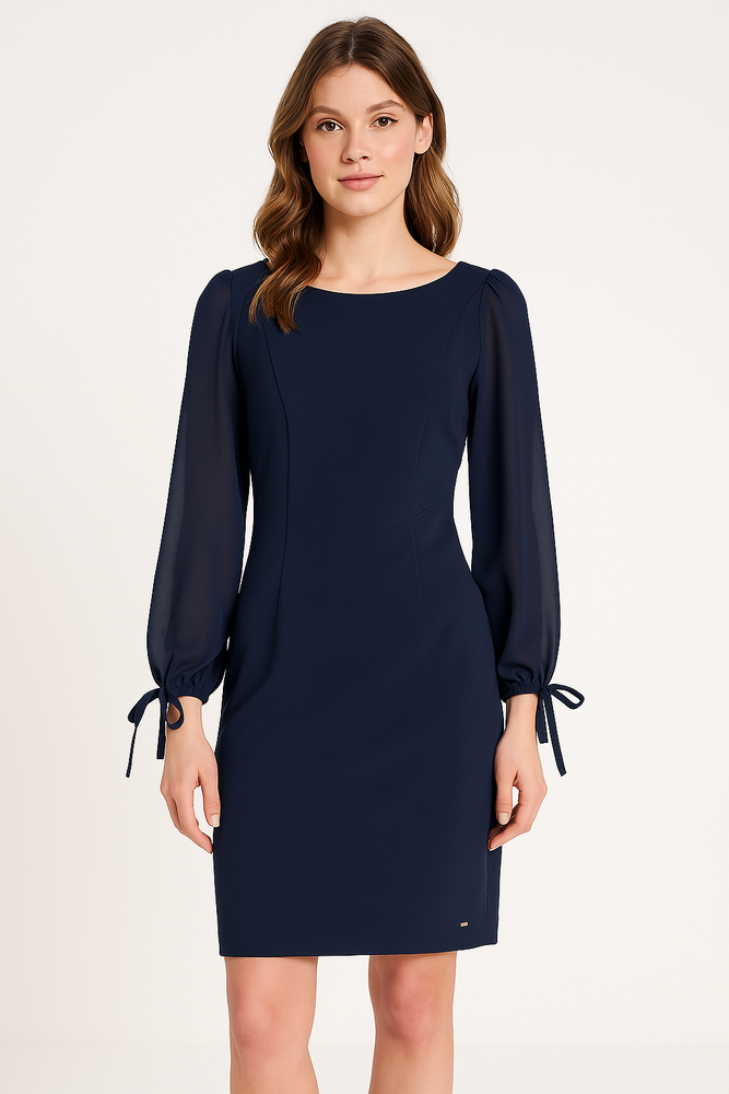 Elegancka sukienka marki Emoi w głębokim odcieniu granatu to idealny wybór na wyjątkowe okazje i spotkania, gdzie liczy się styl i szyk. Fason ołówkowy pięknie podkreśla kobiecą sylwetkę, a delikatnie przejrzyste rękawy z wiązaniami przy mankietach dodają całości lekkości i wyrafinowanego uroku. Sukienka zapinana z tyłu na kryty suwak, co zapewnia komfort noszenia i estetyczne wykończenie. Model doskonały na rodzinne uroczystości, firmowe eventy czy wieczorne kolacje. Skład: 100% poliester Model został wygenerowany komputerowo. Produkt przedstawia rzeczywistą odzież.