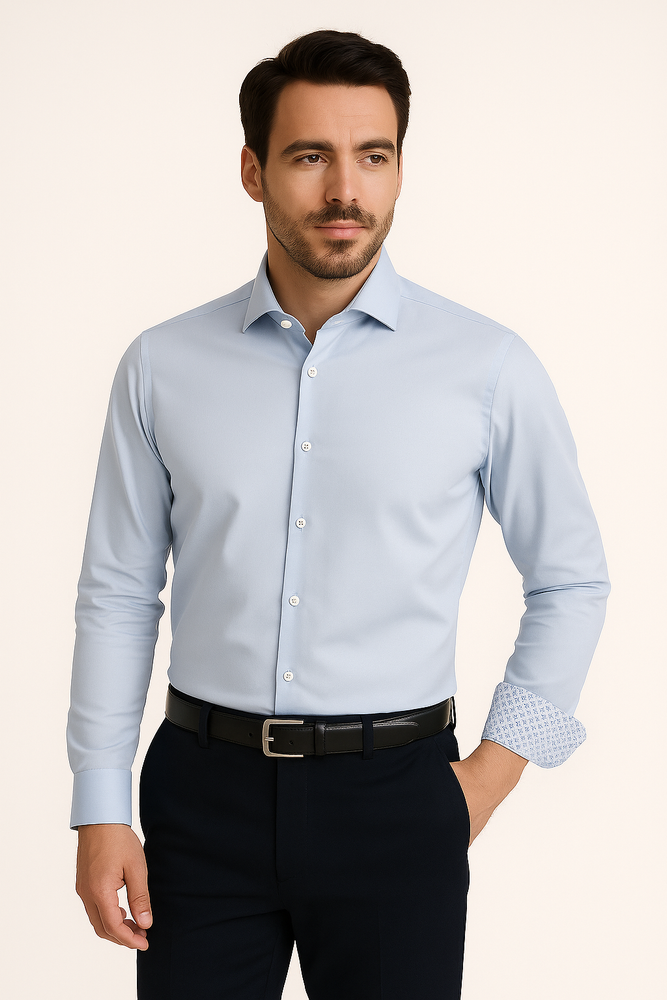 Elegancka koszula męska Pierre Cardin wykonana z wysokiej jakości bawełny to idealny wybór dla mężczyzn, którzy cenią styl i komfort. Model modern fit doskonale dopasowuje się do sylwetki, zapewniając jednocześnie swobodę ruchów. Delikatna, nakrapiana faktura materiału nadaje koszuli nowoczesnego charakteru, a ozdobne kontrasty w kołnierzyku i mankietach podkreślają jej wyjątkowy, designerski styl. Klasyczny kołnierzyk i uniwersalny odcień błękitu sprawiają, że koszula sprawdzi się zarówno na co dzień, jak i podczas formalnych okazji.