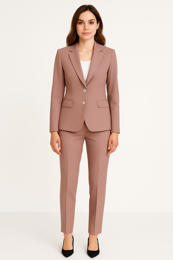 Stylowy komplet damski Onari w odcieniu pudrowego różu to kwintesencja elegancji i klasy. Marynarka z klapami i zapięciem na dwa ozdobne guziki pięknie podkreśla talię, a dopasowane spodnie o zwężanej nogawce dodają nowoczesnego charakteru. Całość wykonana z wysokiej jakości tkaniny z domieszką elastycznych włókien, co zapewnia komfort noszenia i idealne dopasowanie. To doskonały wybór do biura, na spotkania biznesowe lub wyjątkowe okazje, gdy chcesz wyglądać profesjonalnie i kobieco. Skład: 70% wełna, 30% poliester Model wygenerowany komputerowo. Ubranie przedstawia rzeczywisty produkt