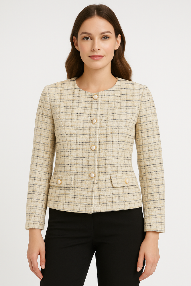 Stylowy żakiet marki Onari to propozycja, która łączy klasyczną elegancję z modowym wyrafinowaniem. Uszyty z tkaniny w subtelną kratę, wzbogacony został o delikatną złotą nitkę, która nadaje mu luksusowego charakteru. Krótszy, dopasowany krój pięknie podkreśla talię, a ozdobne złote guziki stanowią efektowne wykończenie całości. Model z okrągłym dekoltem oraz kieszonkami z patkami doskonale sprawdzi się zarówno w stylizacjach biznesowych, jak i na wyjątkowe okazje. Żakiet świetnie komponuje się z czarnymi spodniami lub elegancką spódnicą. Skład: 60% wełna, 40% poliester Model wygenerowany komputerowo. Ubranie przedstawia rzeczywisty produkt