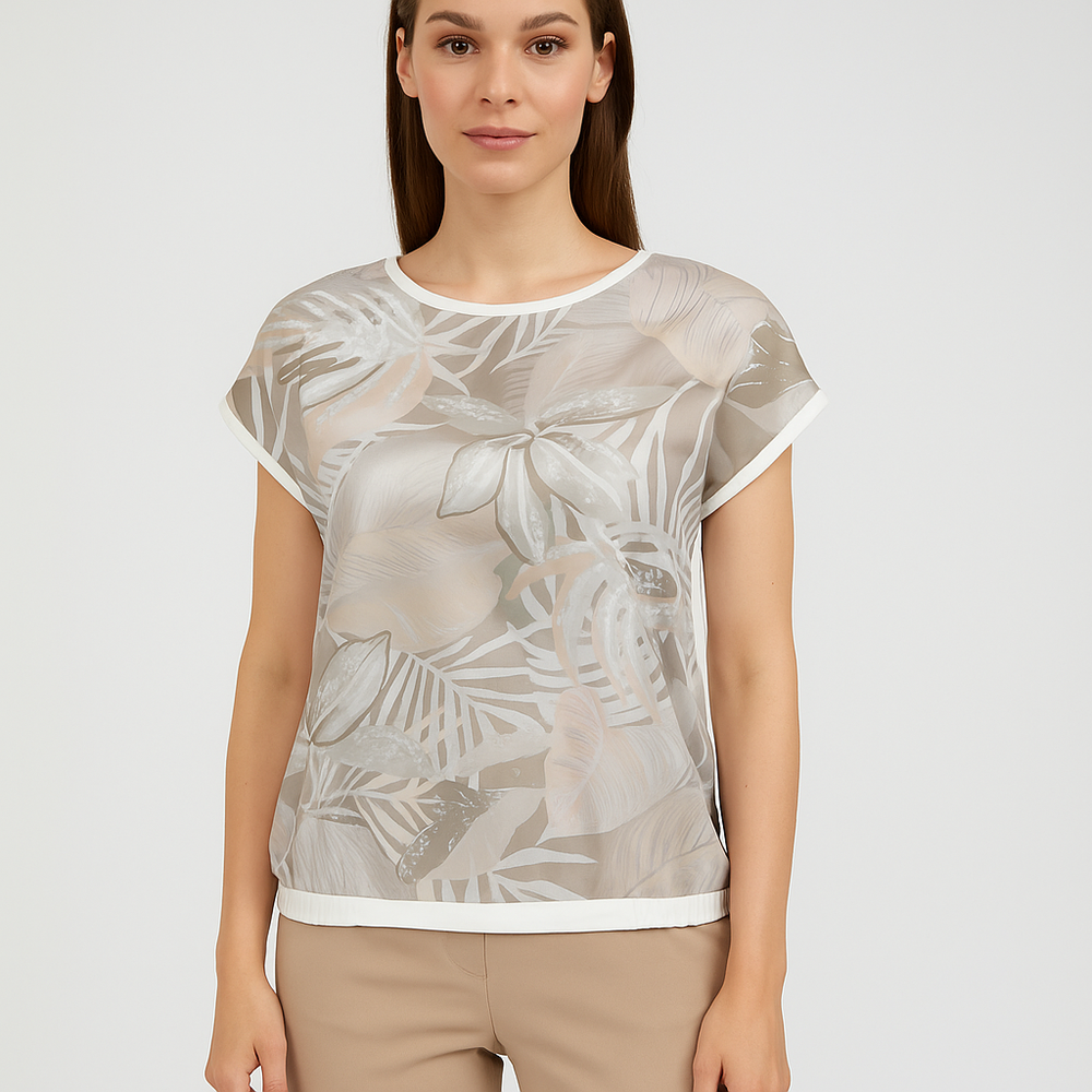 Bluzka marki Madame to połączenie elegancji i komfortu w codziennym wydaniu. Przód wykonany z delikatnej, satynowej tkaniny zachwyca subtelnym, roślinnym nadrukiem w stonowanych odcieniach beżu i bieli, który dodaje stylizacji lekkości i kobiecego uroku. Tył wykonano z jednolitej, gładkiej dzianiny, co zapewnia wygodę i swobodę ruchów. Luźny fason z krótkim rękawem i zaokrąglonym dekoltem sprawia, że bluzka doskonale sprawdzi się zarówno w zestawieniu z klasycznymi spodniami, jak i spódnicą. Idealna propozycja na lato – do pracy, na spotkanie czy weekendowy spacer.