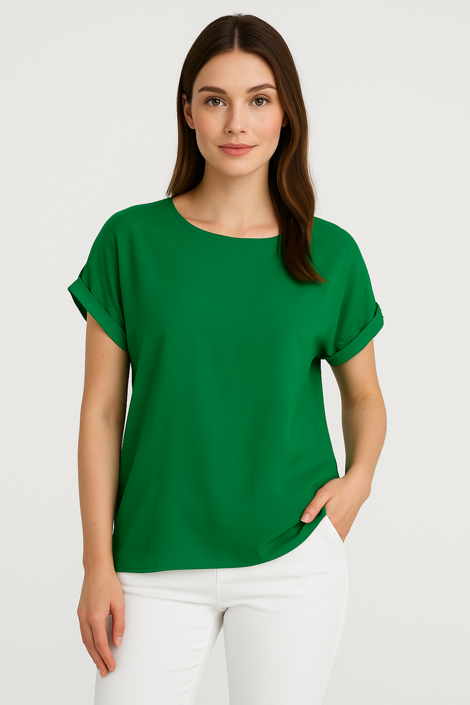 Minimalistyczna, a zarazem wyrazista – bluzka Emoi w intensywnym zielonym kolorze to doskonały wybór dla kobiet ceniących wygodę i styl. Wykonana z lekkiej, oddychającej wiskozy, zapewnia przyjemne uczucie na skórze nawet w cieplejsze dni. Luźny fason z wywijanymi rękawkami i zaokrąglonym dołem sprawia, że bluzka świetnie układa się na sylwetce, nie krępując ruchów. Idealna zarówno do biura, jak i na popołudniowe wyjście – pasuje do spodni, spódnicy czy szortów. Skład: 100% wiskoza Model wygenerowany komputerowo. Ubranie przedstawia rzeczywisty produkt