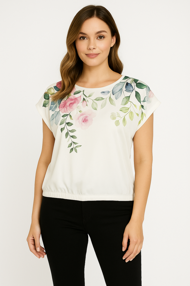 Bluzka marki Madame to połączenie subtelnej elegancji i codziennego komfortu. Przód zdobi efektowny, kwiatowy nadruk, który nadaje całości romantycznego charakteru, natomiast tył wykonano z gładkiej dzianiny z domieszką wiskozy – miękkiej, przyjemnej dla skóry i oddychającej. Luźniejszy fason zakończony delikatną gumką w pasie sprawia, że bluzka świetnie dopasowuje się do sylwetki, a jednocześnie zapewnia swobodę ruchów. To idealny wybór zarówno do jeansów, jak i bardziej eleganckich spodni – świetna baza do wielu kobiecych stylizacji. Skład: 50% wiskoza, 50% poliester Model wygenerowany komputerowo. Ubranie przedstawia rzeczywisty produkt
