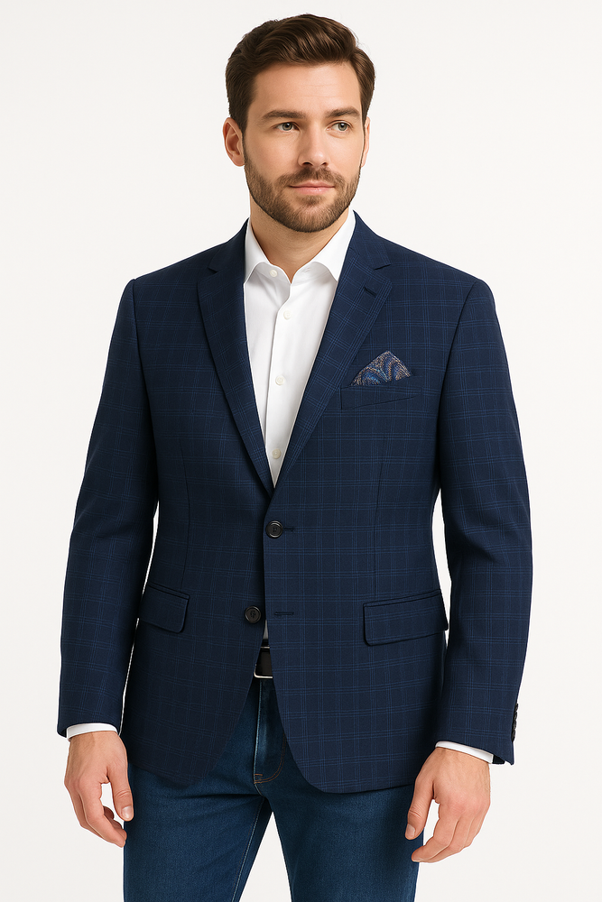 Marynarka marki Vernet w sylwetce D to propozycja dla mężczyzn ceniących elegancję w nowoczesnym wydaniu i wygodę klasycznego kroju. Uszyta z wysokiej jakości tkaniny w granatowym kolorze z delikatną kratką, doskonale sprawdzi się zarówno w stylizacjach biznesowych, jak i smart casual. Model o konstrukcji D oferuje więcej miejsca w klatce piersiowej i talii, zapewniając komfort oraz swobodę ruchów. Klasyczne klapy, zapięcie na dwa guziki oraz kieszenie z patkami podkreślają ponadczasowy charakter marynarki. Dodatkowym akcentem jest poszetka w brustaszy, dodająca stylizacji eleganckiego wyrazu. Idealna do chinosów, jeansów lub klasycznych spodni materiałowych. Skład: 54% poliester, 44% wełna, 2% stretch Model wygenerowany komputerowo. Ubranie przedstawia rzeczywisty produkt