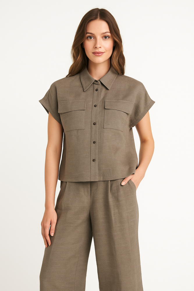 Bluzka marki Vera Moni to doskonałe połączenie naturalnych tkanin i nowoczesnego kroju. Wykonana z przewiewnej mieszanki lnu i wiskozy, zapewnia komfort noszenia nawet w najcieplejsze dni. Krótki rękaw, klasyczny kołnierzyk oraz ozdobne guziki nadają jej eleganckiego charakteru, a naszywane kieszenie z przodu dodają funkcjonalności i modowego sznytu. Stonowany kolor sprawia, że bluzka jest uniwersalna i łatwa do stylizacji. Do kompletu dostępne są spodnie z tej samej tkaniny, które tworzą razem stylowy, letni zestaw idealny zarówno do pracy, jak i na weekendowy wypad.