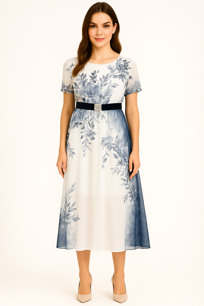 Zachwycająca sukienka marki Boone to połączenie delikatności i kobiecego wdzięku. Wykonana z lekkiego, zwiewnego materiału, wyróżnia się subtelnym kwiatowym wzorem w odcieniach granatu i błękitu na jasnym tle. Rozkloszowany fason o długości do połowy łydki pięknie układa się w ruchu, a przewiewna warstwa zewnętrzna dodaje całości lekkości. Talię podkreśla elegancki pasek z ozdobną klamrą, który nadaje sylwetce smukłości. Sukienka doskonale sprawdzi się na uroczystościach, letnich przyjęciach czy wyjątkowych spotkaniach. Skład: 58% poliester, 40% wiskoza, 2% elastan Model wygenerowany komputerowo. Ubranie przedstawia rzeczywisty produkt