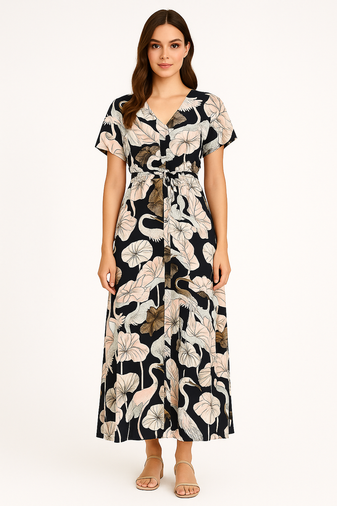 Ta sukienka marki Merce zachwyca oryginalnym, egzotycznym printem w pastelowych odcieniach na ciemnym tle, przedstawiającym motywy florystyczne i ptaki. Wykonana z przewiewnej, miękkiej wiskozy, doskonale sprawdzi się w ciepłe dni – zarówno na co dzień, jak i na wakacyjny wyjazd.