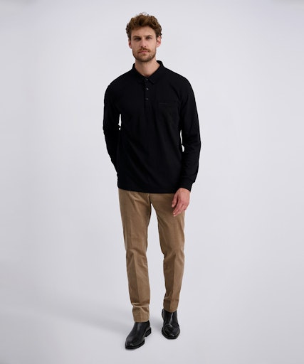 Klasyczna polówka marki Pierre Cardin w eleganckiej czerni. Wykonana z wysokiej jakości bawełny, która zapewnia komfort noszenia i przewiewność. Model z długim rękawem, kołnierzykiem zapinanym na guziki oraz subtelną kieszonką na piersi łączy w sobie ponadczasowy styl i wygodę. Proste wykończenie bez ściągacza z rozporkami po bokach gwarantuje swobodę ruchów i idealne dopasowanie do sylwetki. Uniwersalna propozycja – świetnie sprawdzi się zarówno w stylizacjach codziennych, jak i eleganckich smart-casual.