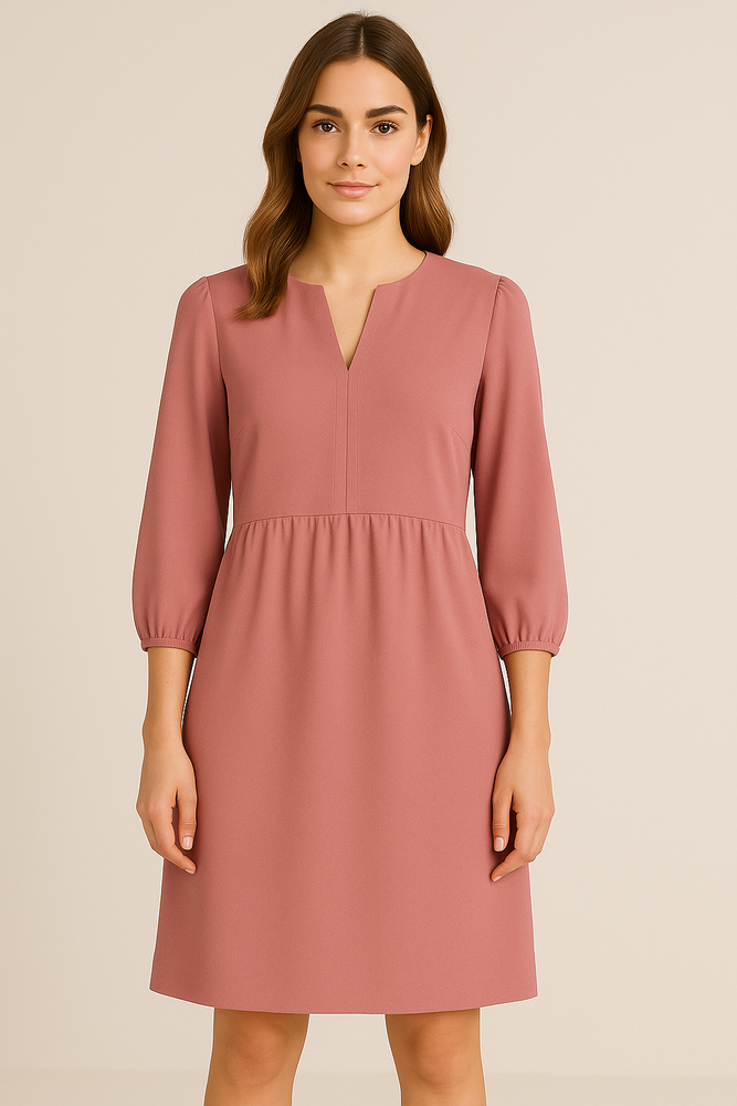 Stylowa sukienka w odcieniu pudrowego różu, wykonana z lekkiej i przewiewnej wiskozy, która pięknie układa się na sylwetce i zapewnia komfort noszenia przez cały dzień. Fason z delikatnym odcięciem pod biustem i prostym dołem subtelnie podkreśla kobiecą figurę, a dekolt w szpic dodaje elegancji. Rękawy 3/4 zakończone lekkim marszczeniem nadają sukience dziewczęcego uroku i uniwersalnego charakteru. Model idealny zarówno na co dzień, jak i na wyjątkowe okazje – wystarczy dobrać odpowiednie dodatki, by stworzyć stylizację w klimacie casualowym lub bardziej eleganckim.