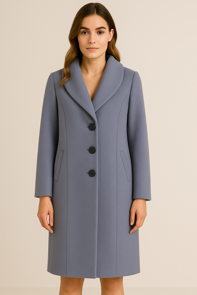 Elegancki płaszcz damski marki Caro w kolorze chłodnego błękitu, wyróżniający się klasycznym fasonem z lekko taliowaną linią. Model zapinany na trzy ozdobne guziki, z szerokim kołnierzem o miękkiej linii, który pięknie układa się przy dekolcie.Po bokach znajdują się praktyczne kieszenie, a długość do kolan sprawia, że płaszcz jest niezwykle uniwersalny – idealny zarówno na co dzień, jak i do eleganckich stylizacji. Wykonany z wysokiej jakości tkaniny z domieszką wełny, gwarantuje komfort cieplny i wygodę noszenia w chłodniejsze dni.