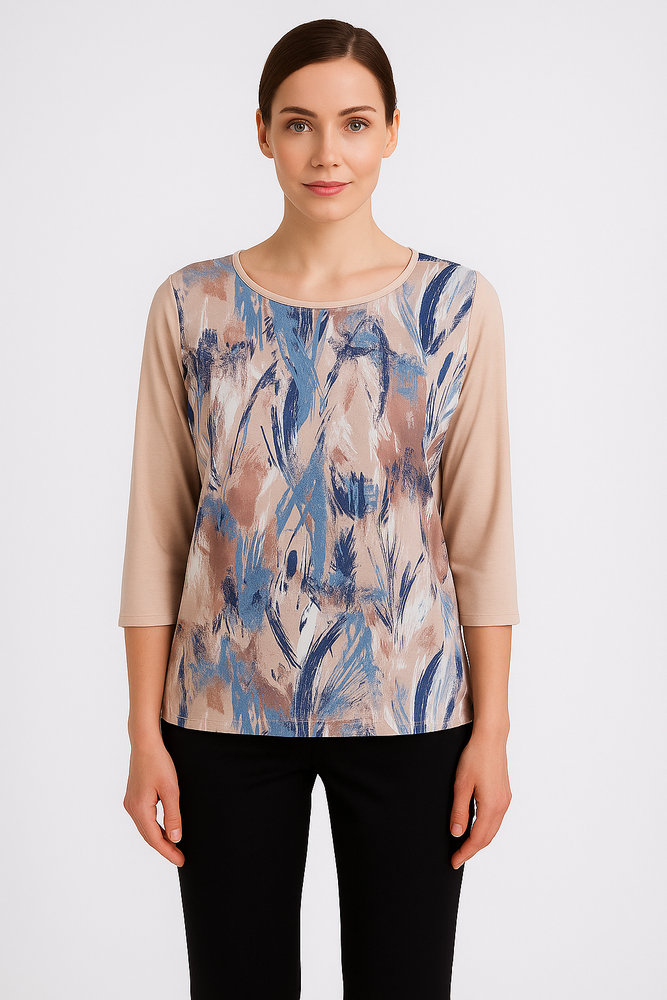 Elegancka bluzka marki Madame o nowoczesnym charakterze. Przód wykonany z lekkiej, satynowej tkaniny z artystycznym nadrukiem w odcieniach beżu i niebieskości, który nadaje całości wyjątkowego stylu. Tył pozostaje gładki, co subtelnie równoważy kompozycję i dodaje uniwersalności. Rękaw 3/4 sprawia, że model świetnie sprawdzi się zarówno w stylizacjach codziennych, jak i bardziej eleganckich. Doskonała do spodni materiałowych czy jeansów, gwarantuje komfort noszenia i szykowny wygląd.