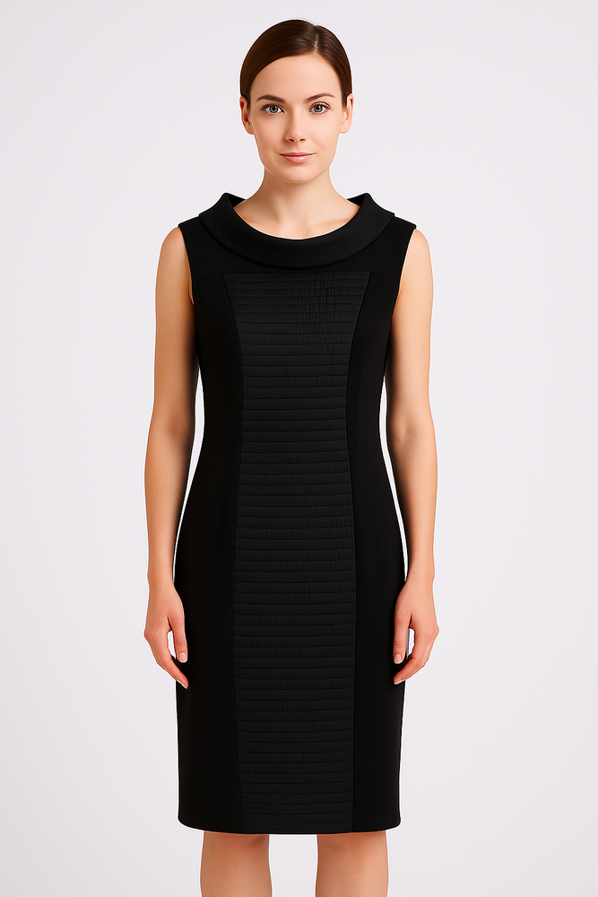 Stylowa czarna sukienka marki Metafora, która łączy klasyczną elegancję z nowoczesnym wykończeniem. Model bez rękawów został zaprojektowany z delikatnie rozszerzającym się kołnierzem oraz efektownym, pikowanym panelem z przodu, który optycznie wysmukla sylwetkę. Fason o długości za kolano doskonale sprawdzi się zarówno na uroczyste okazje, jak i w stylizacjach biznesowych. Wysokiej jakości tkanina gwarantuje komfort noszenia i nienaganny wygląd przez cały dzień.