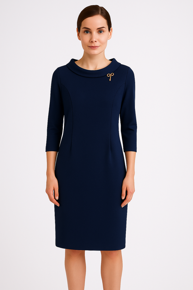 Elegancka sukienka marki Metafora, zaprojektowana z myślą o kobietach ceniących klasykę i ponadczasowy styl. Fason o długości za kolano pięknie podkreśla sylwetkę, a rękaw 3/4 dodaje całości subtelnej elegancji. Ozdobna broszka przy dekolcie stanowi delikatny akcent biżuteryjny, który nadaje kreacji wyjątkowego charakteru. Wykonana z wysokiej jakości tkaniny, gwarantuje wygodę noszenia i świetne układanie się materiału. Idealna propozycja zarówno do pracy, jak i na uroczyste spotkania.