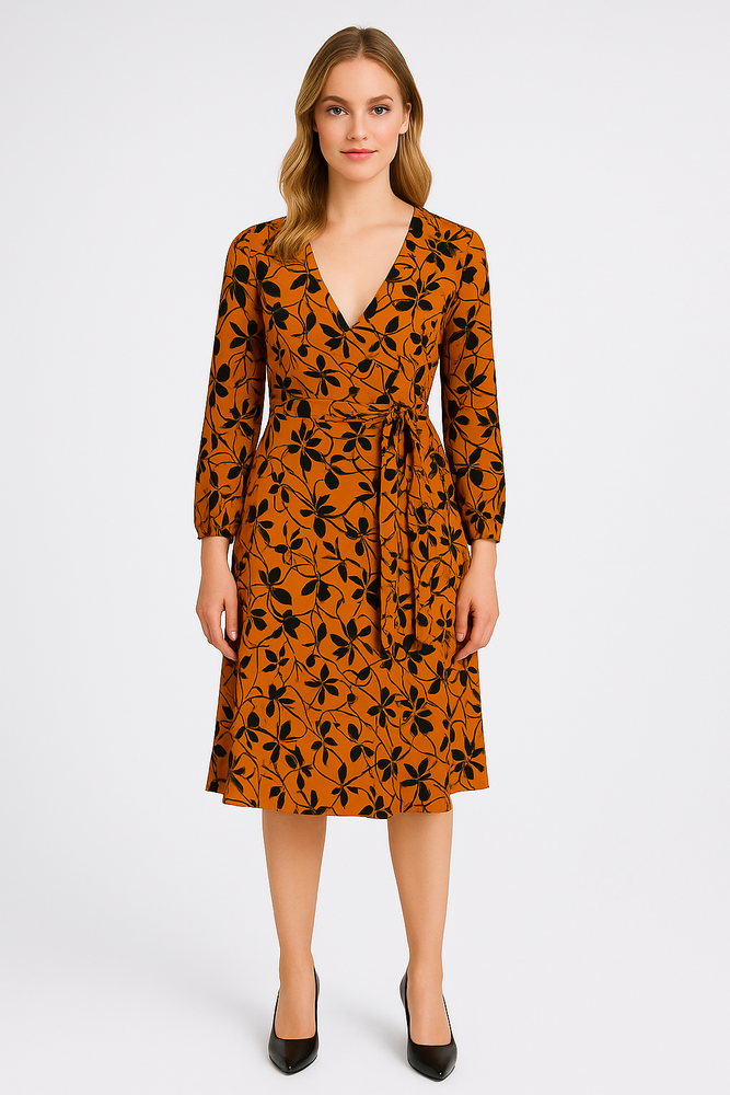 Elegancka sukienka marki Metafora wykonana z miękkiej i przyjemnej w dotyku wiskozy. Fason z kopertowym dekoltem subtelnie podkreśla kobiecą sylwetkę, a dołączony pasek w talii pozwala idealnie dopasować kreację do figury. Długość za kolano i lekko rozkloszowany dół nadają całości zwiewności i lekkości. Model doskonały zarówno na co dzień, jak i na wyjątkowe okazje – łączy w sobie wygodę oraz ponadczasową elegancję.