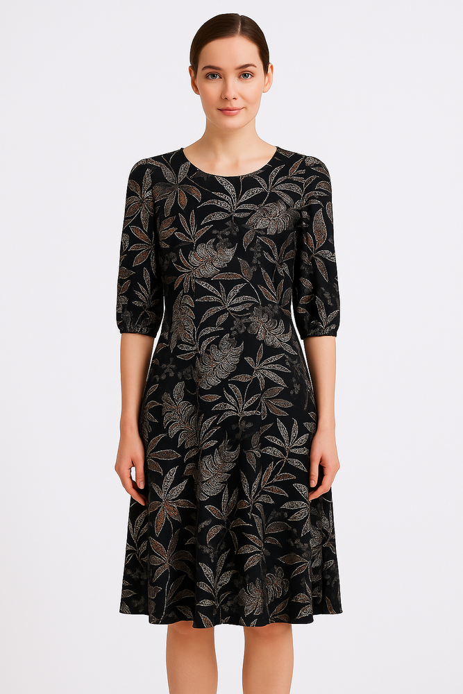 Elegancka sukienka marki Emoi, wykonana z lekkiej i przewiewnej wiskozy, która pięknie układa się na sylwetce i zapewnia komfort noszenia. Czarna baza została ozdobiona efektownym, roślinnym wzorem w odcieniach miedzi i srebra, co nadaje całości szykownego charakteru. Fason z rękawem 3/4 oraz długością za kolano sprawia, że kreacja jest niezwykle kobieca i uniwersalna. Idealna zarówno na co dzień, jak i na wyjątkowe okazje – doda elegancji w każdej stylizacji.