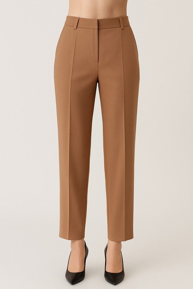Klasyczne spodnie damskie w kolorze karmelowym, zaprojektowane z myślą o elegancji i wygodzie. Prosty fason z lekko zwężaną nogawką optycznie wysmukla sylwetkę, a kant nadaje całości szykownego charakteru. Spodnie posiadają szlufki na pasek, zapięcie na suwak i haftkę, co gwarantuje idealne dopasowanie w talii. Wykonane z wysokiej jakości tkaniny, która dobrze się układa i zapewnia komfort noszenia przez cały dzień. Model doskonale sprawdzi się w zestawie z żakietem w tym samym kolorze, tworząc ponadczasowy garnitur, ale równie efektownie prezentuje się w stylizacjach smart casual z koszulą.
