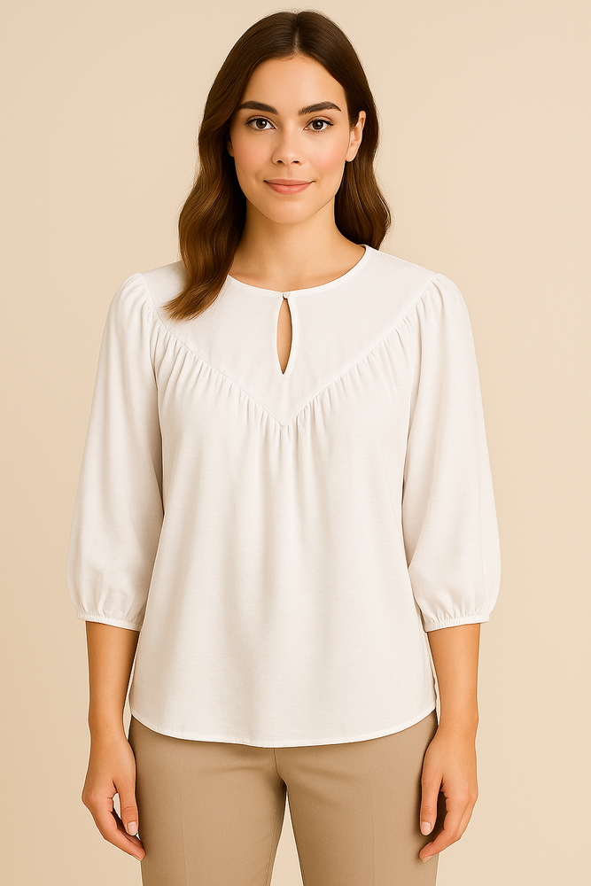 Subtelna bluzka marki Emoi w kolorze klasycznej bieli, wykonana z lekkiej i przewiewnej tkaniny, która delikatnie układa się na sylwetce. Luźny fason zapewnia komfort noszenia, a rękawy 3/4 zakończone delikatnym mankietem dodają jej kobiecego uroku. Dekolt został wykończony efektownym rozcięciem w kształcie łezki, zapinanym na ozdobną perełkę – elegancki detal, który podkreśla wyjątkowy charakter modelu. Bluzka doskonale sprawdzi się zarówno w codziennych stylizacjach, jak i w zestawieniach bardziej formalnych, np. z eleganckimi spodniami czy spódnicą.