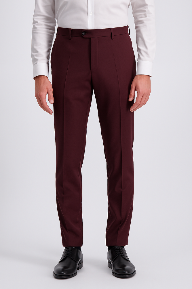 Eleganckie spodnie marki Pierre Cardin w kolorze głębokiego bordo, wykonane z wysokiej jakości wełny z domieszką elastycznych włókien, co zapewnia komfort noszenia i swobodę ruchów. Fason ze zwężaną nogawką oraz kantem optycznie wysmukla sylwetkę, a klasyczne detale – szlufki na pasek, zapięcie na guzik i zamek – podkreślają ponadczasowy charakter. Doskonała propozycja zarówno na formalne spotkania, jak i wyjątkowe okazje. Model tworzy komplet z marynarką Pierre Cardin w tym samym odcieniu, co pozwala na skomponowanie pełnego garnituru o nowoczesnym i stylowym wyrazie.