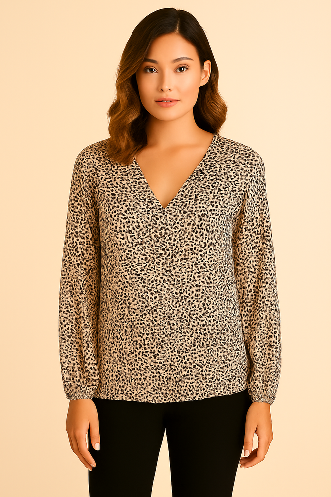 Bluzka marki Getex wykonana z delikatnej wiskozy to propozycja, która łączy kobiecy szyk z komfortem noszenia. Miękki, przewiewny materiał subtelnie układa się na sylwetce, zapewniając wygodę przez cały dzień. Beżowy odcień z drobnym, panterkowym nadrukiem nadaje jej modnego, a zarazem uniwersalnego charakteru. Dekolt w szpic pięknie wysmukla szyję, a rękawy zakończone lekkim marszczeniem dodają lekkości i elegancji. Doskonała do zestawienia zarówno z klasycznymi spodniami, jak i ołówkową spódnicą — idealna na co dzień i do pracy.