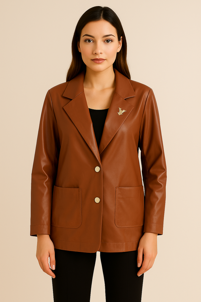 Żakiet marki Victoria Rosehill to nowoczesna propozycja wykonana z wysokiej jakości ekoskóry w eleganckim odcieniu. Klasyczny krój z klapami i złotymi detalami, w tym ozdobnymi guzikami oraz subtelną broszką, dodaje całości wyrafinowanego charakteru. Praktyczne kieszenie podkreślają jego funkcjonalność, a tył wykończony gumką zapewnia lepsze dopasowanie do sylwetki i wygodę noszenia. To model, który świetnie sprawdzi się zarówno w codziennych stylizacjach, jak i jako stylowy akcent w eleganckim zestawie.