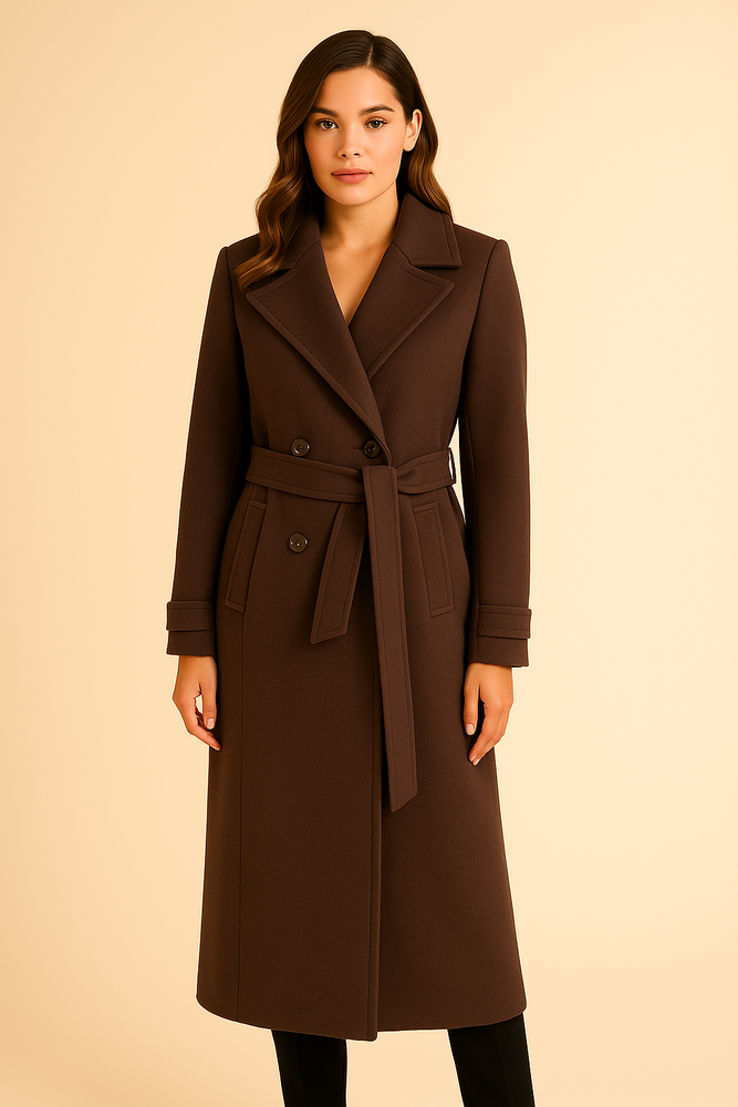 Klasyczny fason z dwurzędowym zapięciem i paskiem w talii subtelnie podkreśla sylwetkę, a szerokie klapy dodają całości szyku.