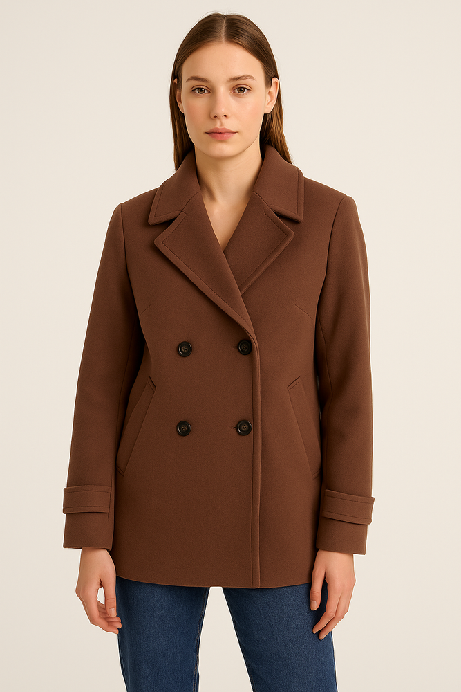 Krótki płaszczyk marki Emoi to elegancka propozycja w klasycznym wydaniu, idealna na sezon przejściowy i zimowy. Wykonany z wysokiej jakości wełny z domieszką włókien syntetycznych, gwarantuje ciepło, komfort i trwałość. Model o dwurzędowym kroju z wyraźnie zaznaczonymi klapami kołnierza pięknie układa się na sylwetce, nadając jej elegancji i ponadczasowego charakteru. Subtelne kieszenie z patkami oraz dekoracyjne mankiety podkreślają dopracowane detale projektu. To uniwersalny płaszczyk, który doskonale sprawdzi się zarówno w zestawieniu z jeansami i botkami, jak i z elegancką spódnicą czy sukienką.
