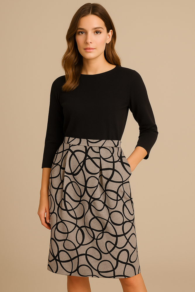 Spódnica marki Metafora to stylowa propozycja o nowoczesnym, a zarazem kobiecym charakterze. Wykonana z miękkiej, elastycznej tkaniny bez podszewki z kieszeniami po bokach, zapewnia swobodę ruchów i wygodę noszenia przez cały dzień. Model o lekko rozkloszowanym kroju z delikatnymi zaszewkami pięknie układa się na sylwetce, podkreślając talię i nadając figurze lekkości. Szary materiał z efektownym czarnym, graficznym wzorem przyciąga uwagę i dodaje całości oryginalności. Spódnica doskonale sprawdzi się w zestawieniu z jednolitą bluzką, golfem lub klasycznym swetrem – zarówno do biura, jak i w stylizacjach codziennych.