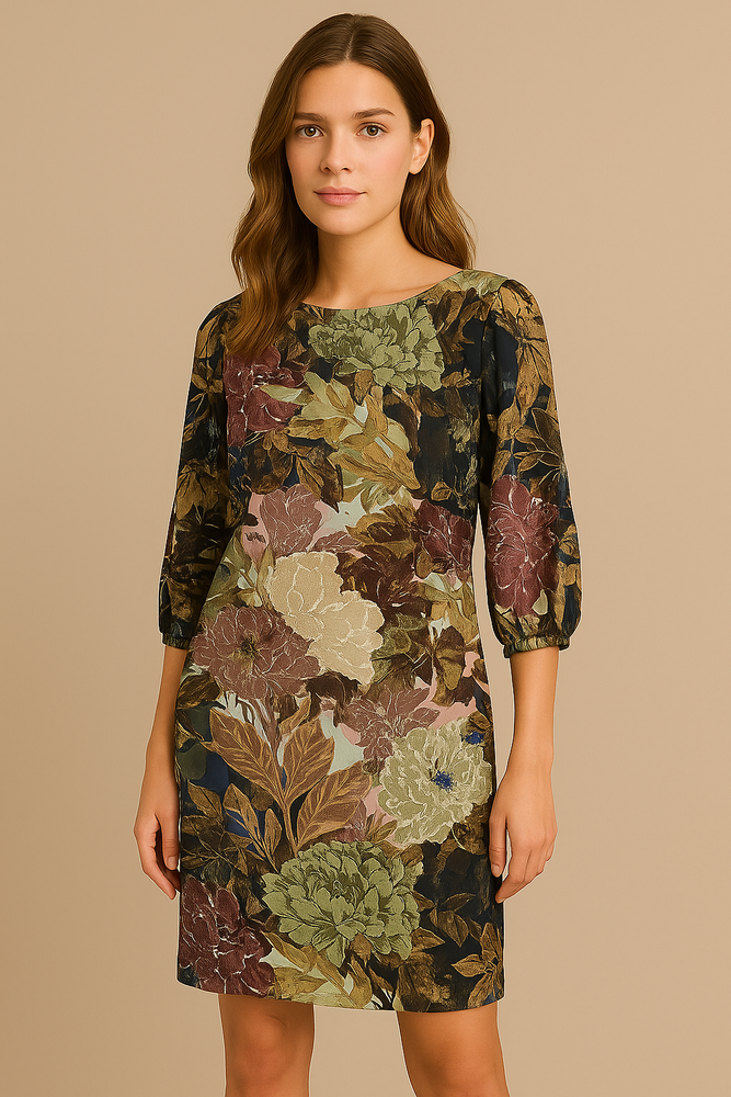 Sukienka marki Emoi to elegancka propozycja, która zachwyca bogactwem barw i kobiecym wdziękiem. Wykonana z lekkiej, przyjemnej w dotyku tkaniny, doskonale dopasowuje się do sylwetki, zapewniając komfort noszenia przez cały dzień. Model o prostym kroju z delikatnie bufowanym rękawem 3/4 pięknie prezentuje się na każdej figurze. Sukienka wyróżnia się efektownym, kwiatowym wzorem w odcieniach zieleni, bordo, beżu i granatu, który nadaje jej wyjątkowego, artystycznego charakteru. Świetnie sprawdzi się zarówno na co dzień, jak i w eleganckich stylizacjach – wystarczy dodać botki, klasyczny płaszcz lub delikatną biżuterię, by stworzyć pełen klasy look.