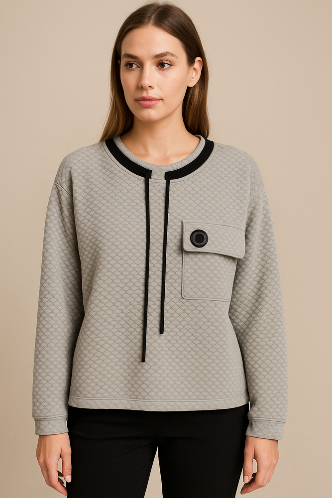Bluzka marki Victoria Rosehill to połączenie nowoczesnego designu i wygody w eleganckim wydaniu. Wykonana z miękkiej, przestrzennej tkaniny o strukturze drobnych heksagonów, doskonale dopasowuje się do sylwetki, zapewniając komfort noszenia przez cały dzień. Dekolt wykończony czarną lamówką i ozdobne troczki dodają całości nowoczesnego charakteru, a asymetryczna kieszeń z dużą naszywką to modny detal, który przyciąga wzrok i podkreśla indywidualny styl. Uniwersalny, lekko luźny fason sprawia, że bluzka świetnie komponuje się zarówno ze spodniami typu slim, jak i eleganckimi cygaretkami. Idealna do stylizacji casualowych i biurowych.