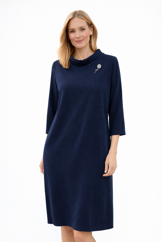 Elegancka sukienka marki Getex to harmonijne połączenie klasyki i subtelnej nowoczesności. Wykonana z wysokiej jakości, miękko układającej się tkaniny, pięknie dopasowuje się do sylwetki, zapewniając komfort noszenia przez cały dzień. Efektowny dekolt z delikatnym wykończeniem przyciąga uwagę i nadaje całości wyrafinowanego charakteru, jednocześnie wysmuklając górną część sylwetki. Model o długości do pół kolana oraz rękawach 3/4 doskonale sprawdzi się zarówno na co dzień, jak i na eleganckie okazje. Całość dopełnia ozdobna broszka, która stanowi stylowy akcent i podkreśla wyjątkowy charakter sukienki. To idealna propozycja dla kobiet ceniących elegancję, wygodę i dopracowane detale w ponadczasowym wydaniu.
