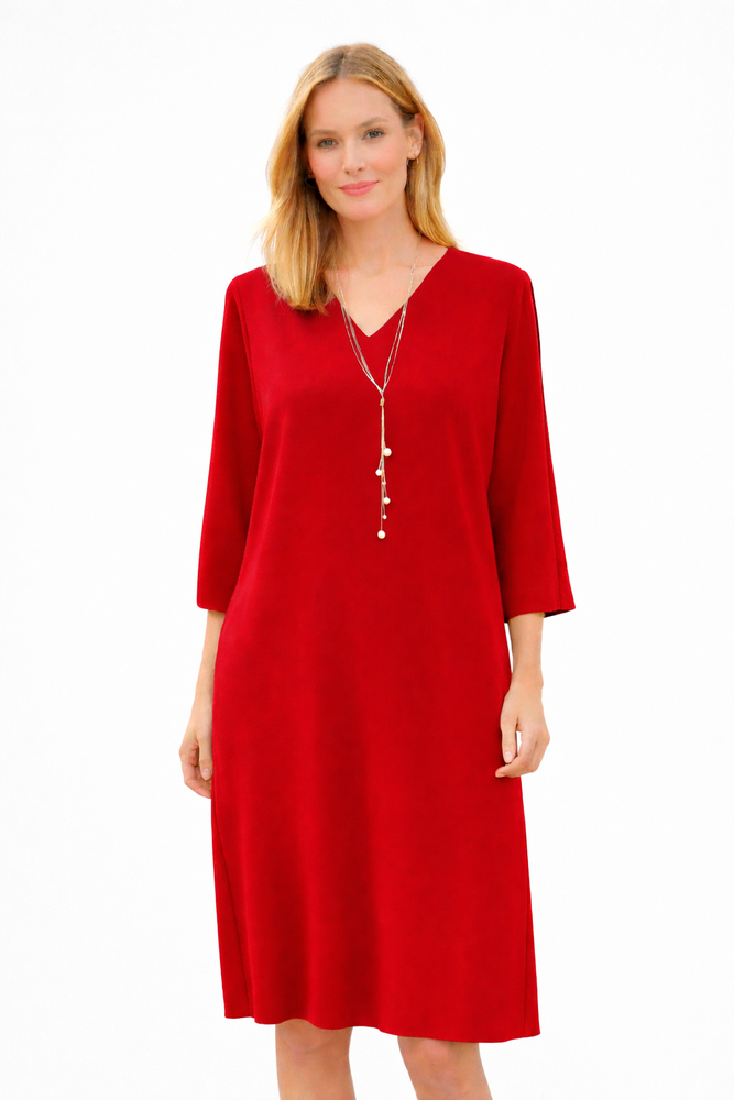 Elegancka sukienka marki Getex to doskonałe połączenie klasycznej formy i nowoczesnych detali. Wykonana z lekkiej, przyjemnej w dotyku tkaniny, pięknie układa się na sylwetce i zapewnia komfort noszenia przez cały dzień. Dekolt w kształcie litery V subtelnie wysmukla szyję, a rękawy o długości 3/4 dodają całości uniwersalnego, ponadczasowego charakteru. Model o długości do pół kolana sprawdzi się zarówno w codziennych stylizacjach, jak i na bardziej eleganckie okazje. W komplecie znajduje się ozdobny wisior, który stanowi stylowe dopełnienie sukienki i pozwala stworzyć gotowy, spójny look bez potrzeby dobierania dodatkowej biżuterii. To idealna propozycja dla kobiet ceniących wygodę, elegancję i dopracowane detale.