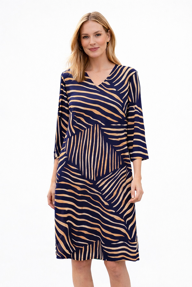 Zwiewna sukienka marki Getex zachwyca lekkością i nowoczesnym wzorem, który nadaje stylizacji wyrazisty, a jednocześnie elegancki charakter. Luźny, komfortowy fason pięknie układa się na sylwetce i zapewnia swobodę ruchów przez cały dzień. Model bez podszewki sprawia, że sukienka jest wyjątkowo lekka i idealna na cieplejsze dni. Dekolt w kształcie litery V subtelnie podkreśla linię szyi, a długość do pół kolana czyni ją doskonałym wyborem zarówno na co dzień, jak i na bardziej formalne okazje. To propozycja dla kobiet ceniących wygodę, styl i ponadczasową elegancję.