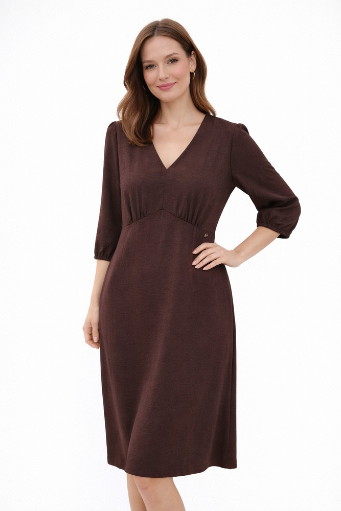 Brązowa sukienka marki Emoi to elegancka i jednocześnie niezwykle komfortowa propozycja na co dzień oraz na specjalne okazje. Wykonana z lekkiej, zwiewnej tkaniny bez podszewki, miękko układa się na sylwetce, zapewniając swobodę ruchów i przyjemność noszenia przez cały dzień. Dekolt w kształcie litery V subtelnie podkreśla szyję i wysmukla górną część sylwetki, a delikatnie zaznaczona linia pod biustem nadaje sukience kobiecego charakteru. Rękawy o długości 3/4 z lekkim marszczeniem dodają całości lekkości i stylowego wykończenia. Model o długości do pół kolana doskonale sprawdzi się zarówno w codziennych stylizacjach, jak i podczas spotkań czy wyjść, kiedy liczy się naturalna elegancja i wygoda.