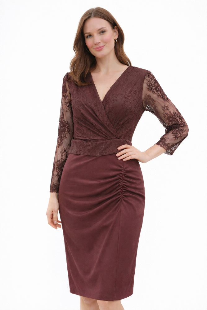 Elegancka brązowa sukienka marki Merce to propozycja dla kobiet, które cenią klasyczny styl z nutą wyrafinowania. Model wyróżnia się subtelną koronką, która nadaje całości wyjątkowego, kobiecego charakteru i delikatnie podkreśla elegancję stylizacji. Dekolt w kształcie litery V pięknie eksponuje szyję i wysmukla sylwetkę, a koronkowe rękawy dodają lekkości i szyku. Dopasowany fason z delikatnym marszczeniem w okolicy bioder podkreśla kobiece kształty, jednocześnie zapewniając komfort noszenia. Długość do pół kolana sprawia, że sukienka doskonale sprawdzi się na uroczystości, przyjęcia, rodzinne spotkania czy eleganckie wyjścia. To stylowa i ponadczasowa propozycja, która pozwoli poczuć się wyjątkowo w każdej sytuacji.